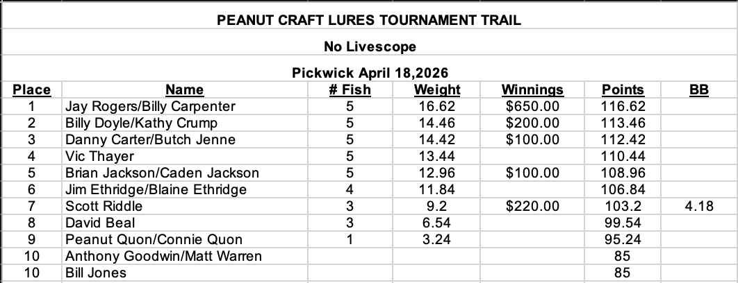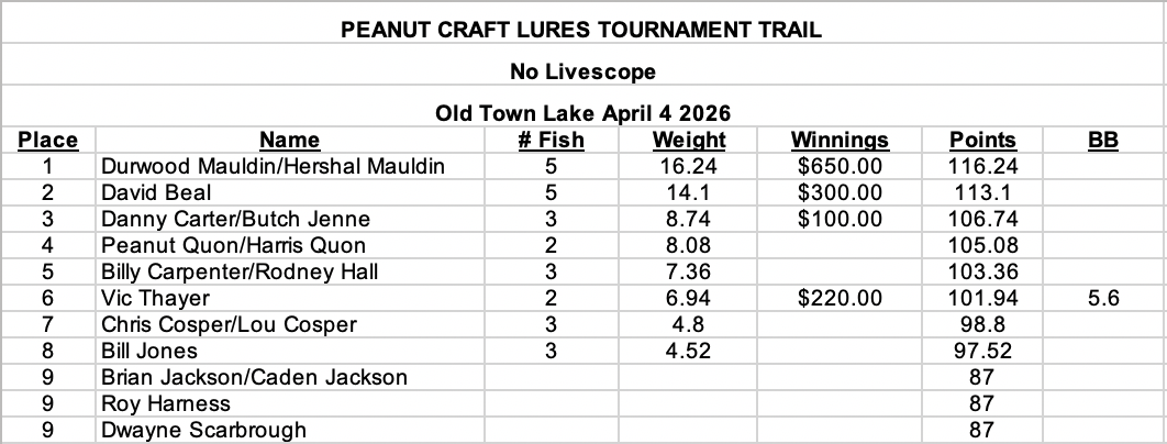 Thanks for visiting the Peanutcraft Lures Tournament website!Our goal is to provide useful information about our Tournament, rules, and present Anglers with many ideal fishing opportunities available in the South.